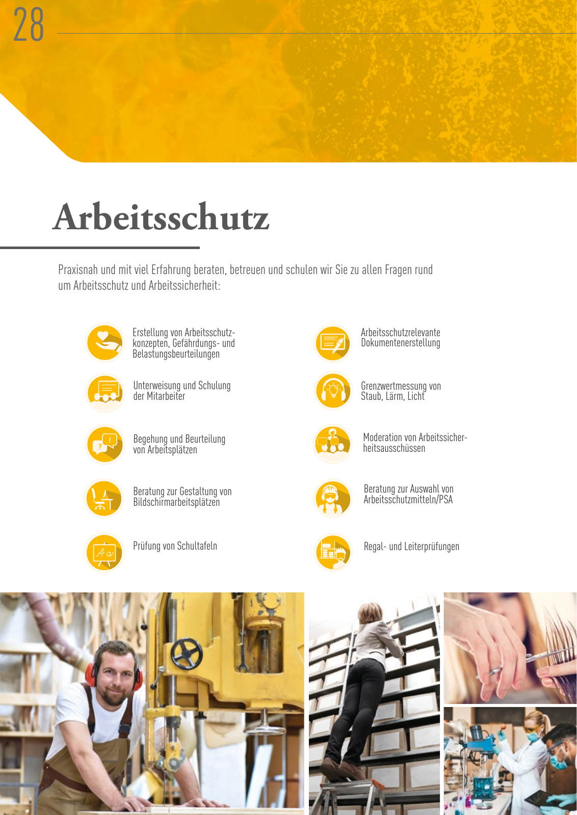 CONCERT Praxisnah und mit viel Erfahrung beraten betreuen und schulen wir Sie zu allen Fragen rund um Arbeitsschutz und Arbeitssicherheit Erstellung von Arbeitsschutz konzepten Gefährdungs und Belastungsbeurteilungen Unterweisung und Schulung der Mitarbeiter Begehung und Beurteilung von Arbeitsplätzen Beratung zur Gestaltung von Bildschirmarbeitsplätzen Moderation von Arbeitssicher heitsausschüssen Beratung zur Auswahl von Arbeitsschutzmitteln PSA Prüfung von Schultafeln Regal und Leiterprüfungen Arbeitsschutzrelevante Dokumentenerstellung Grenzwertmessung von Staub Lärm Licht Arbeitsschutz 28 A a